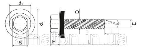 | Розмір DxL, мм | Е, діаметр свердла, мм | Т, довжина свердла, мм | Н, висота головки, мм | S, розмір під насадку, мм | d1, діаметр прес-шайби, мм | d2, діаметр шайби з ущільнювачем ЕРDM, мм |